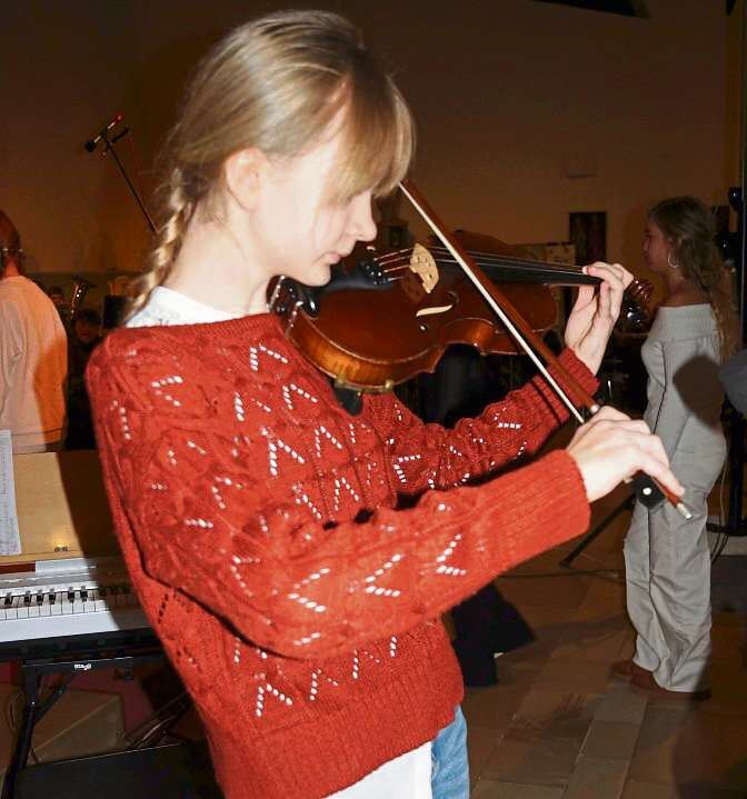 Das folgende Programm war abwechslungsreich, beinhaltete viele bekannte Lieder und Melodien und auch Beiträge von Solisten und Lesungen. Unter der Leitung von Georg Kulzer stieg die Bläserklasse mit dem bekannten Lied „Alle Jahre wieder“ in das Programm ein. Unter dessen Leitung spielte die ein Jahr jüngere Klasse „Morgen kommt der Weihnachtsmann“ und „Jingle Bells“. Keinerlei Lampenfieber war bei den drei Klaviersolisten Emma Aschenbrenner, Julia Borodihin und Anna Grub spürbar. Mit dem Akkordeon erinnerte Martin Fischer an Weihnachten wie es früher einmal war.