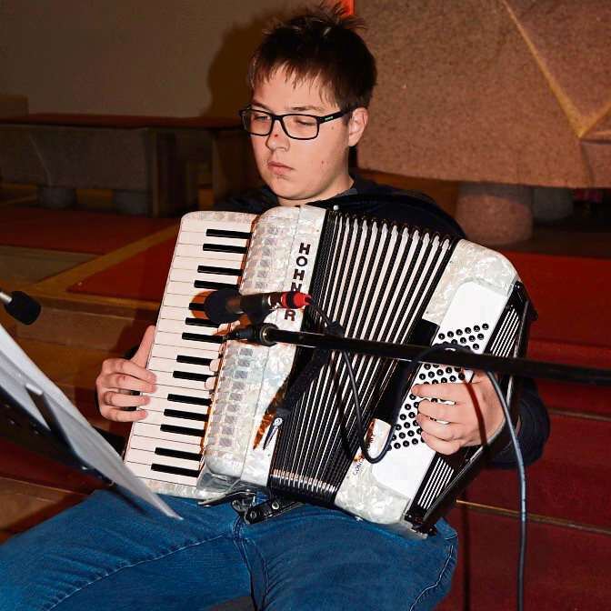 Das folgende Programm war abwechslungsreich, beinhaltete viele bekannte Lieder und Melodien und auch Beiträge von Solisten und Lesungen. Unter der Leitung von Georg Kulzer stieg die Bläserklasse mit dem bekannten Lied „Alle Jahre wieder“ in das Programm ein. Unter dessen Leitung spielte die ein Jahr jüngere Klasse „Morgen kommt der Weihnachtsmann“ und „Jingle Bells“. Keinerlei Lampenfieber war bei den drei Klaviersolisten Emma Aschenbrenner, Julia Borodihin und Anna Grub spürbar. Mit dem Akkordeon erinnerte Martin Fischer an Weihnachten wie es früher einmal war.