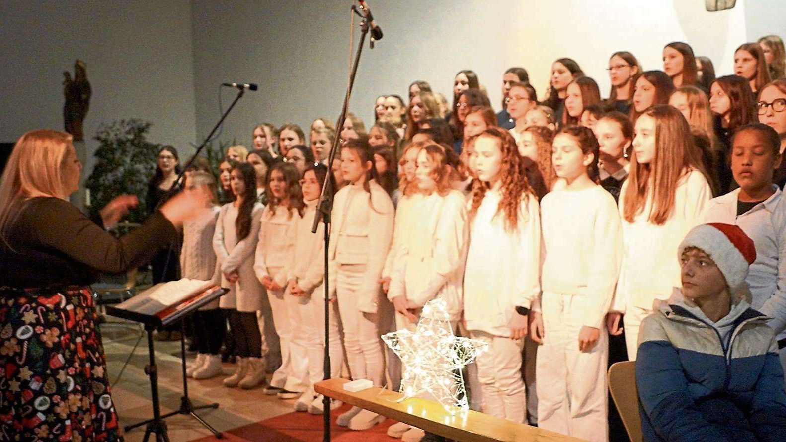 Klavierstücke, ein Stück der Schulband unter der Leitung von Alexandra Gebhardt, Lena Schwarzfischer als Geigensolistin und die Bläserklasse sowie das Orchester Blechschon leiteten in ein großartiges Finale mit den beiden Chorklassen und dem Schulchor mit fast 90 Mitwirkenden über. Stimmgewaltig und temperamentvoll von Claudia Kronschnabl dirigiert, bildete es einen krönenden Abschluss. Tosender Beifall brandete auf. Dadurch regelrecht animiert, gab es mit dem Lied „Feliz Navidad“ auch noch eine bekannte Zugabe.